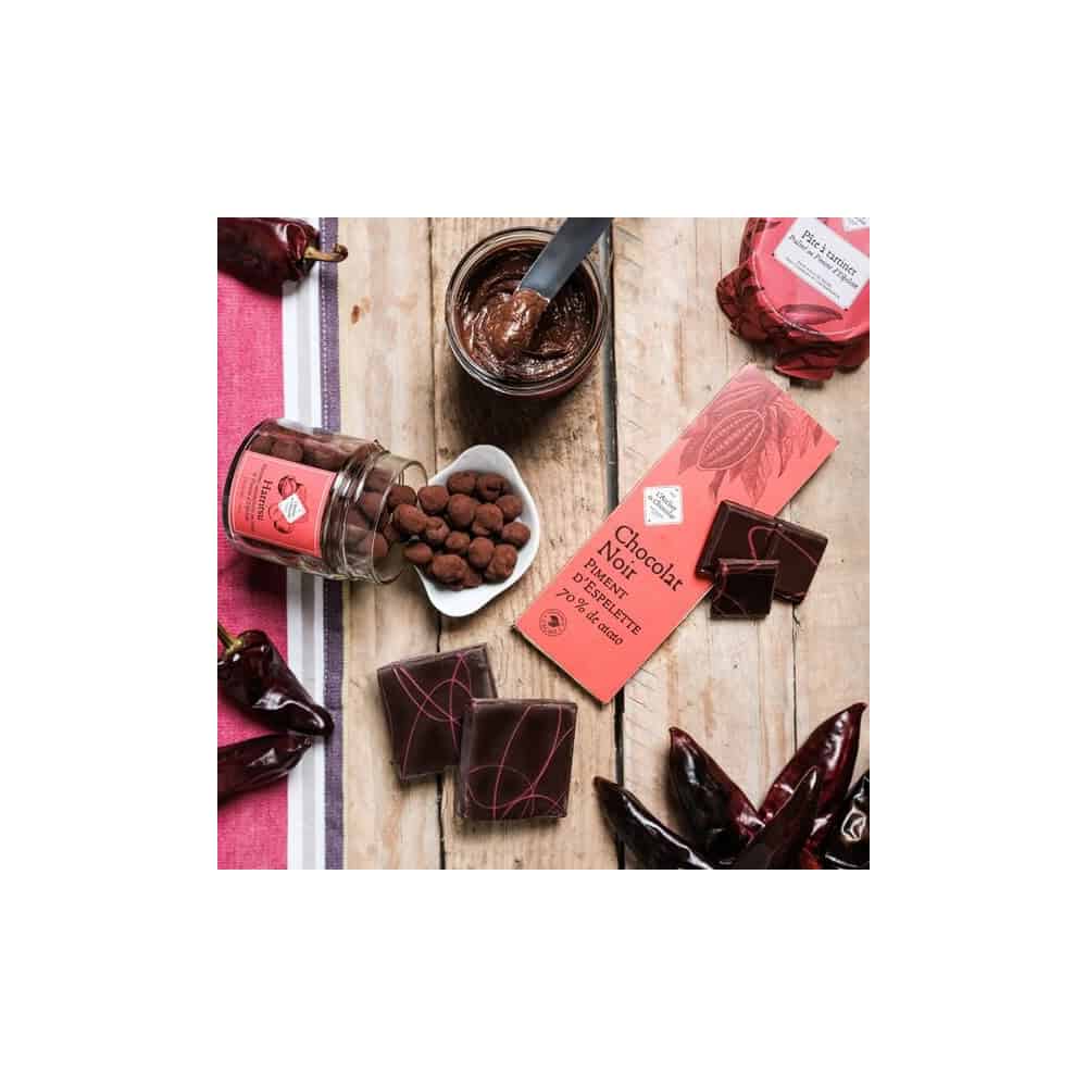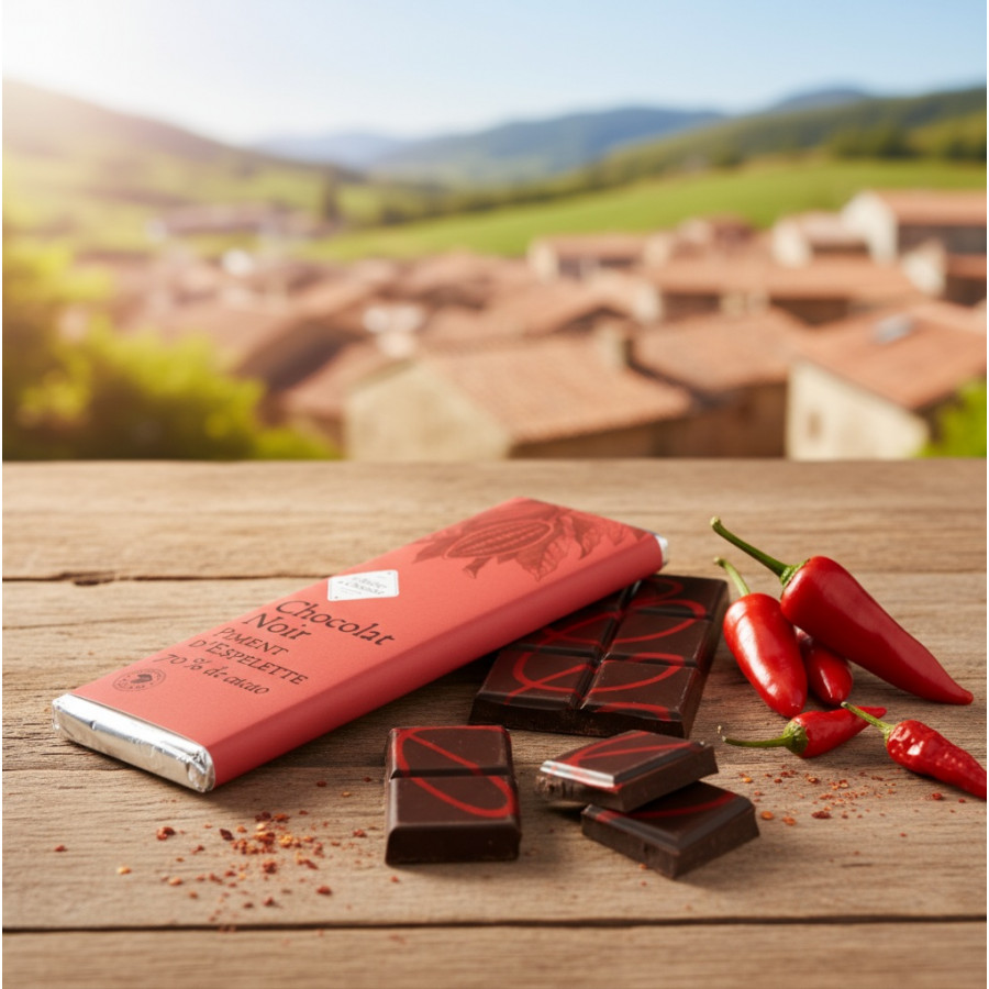 Add a bold touch to your chocolate enjoyment with the Tablette de Chocolat Noir au Piment d'Espelette, a unique creation that combines the intensity of dark chocolate with the spicy character of the famous Basque chilli pepper. Developed by L'Atelier du Chocolat, this bar reveals a subtle balance between the bitter sweetness of cocoa and the delicate heat of chilli.