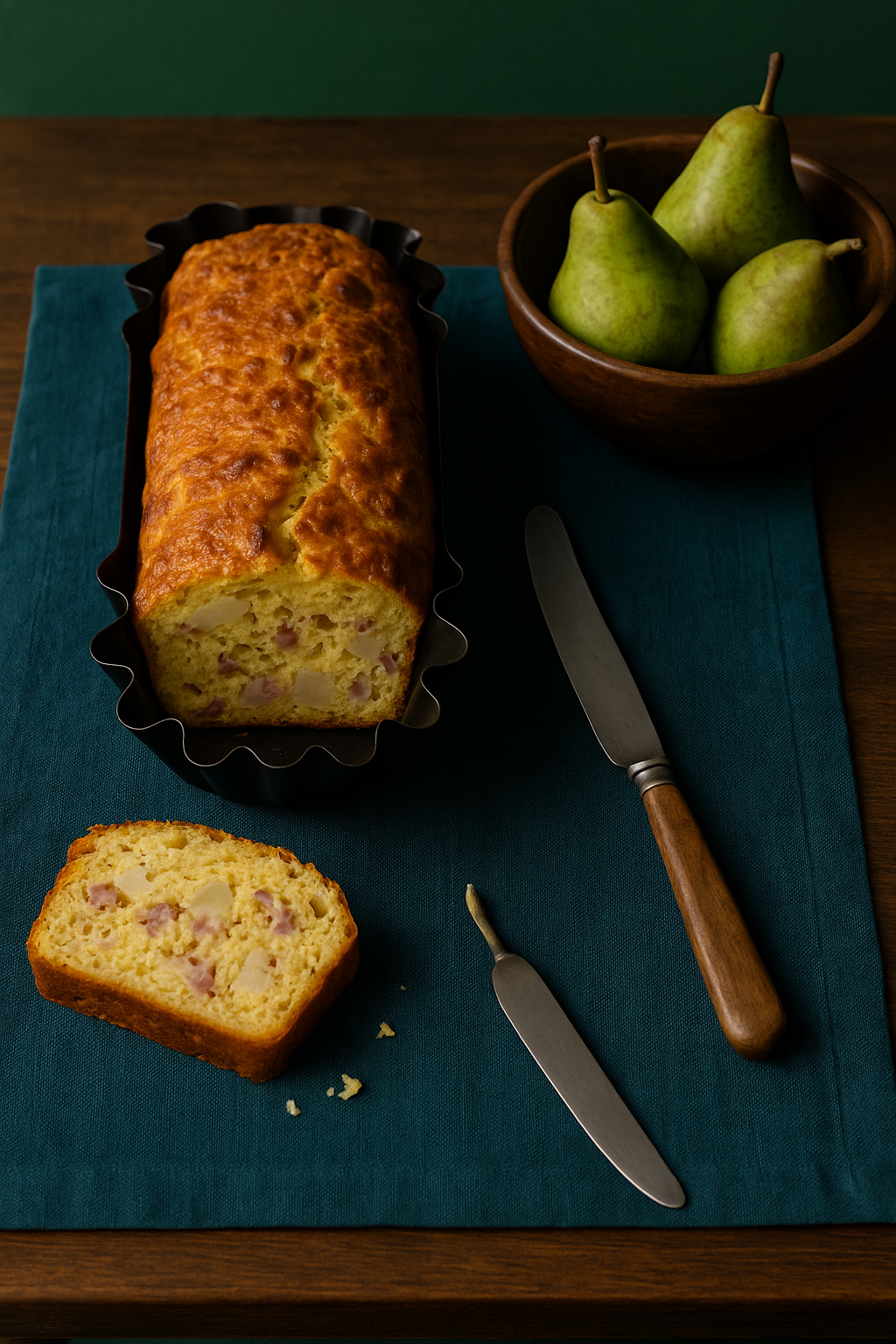 CAKE MOELLEUX À LA POIRE, AU FROMAGE DE BREBIS ET AU JAMBON DE BAYONNE