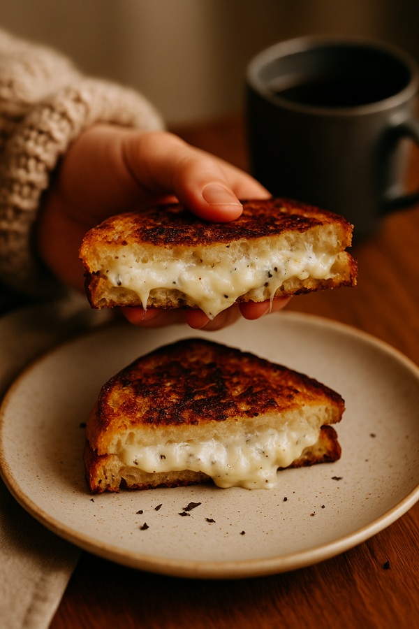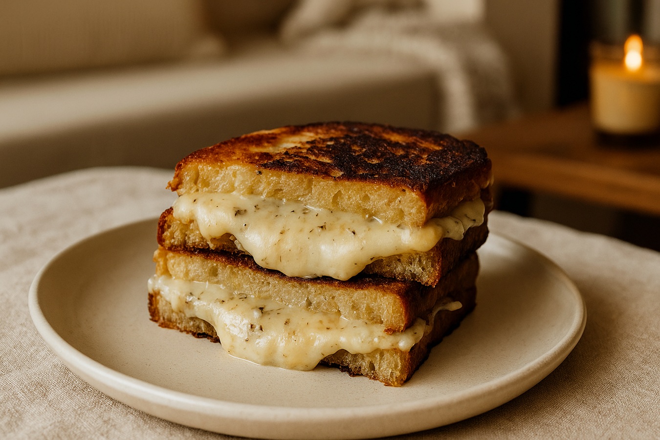 - Servez : Dégustez votre grilled cheese à la truffe chaud. Vous pouvez le couper en triangles pour une présentation élégante.