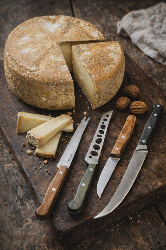 Pour des fromages de brebis plus affinés, à pâte plus dense, un couteau robuste et bien équilibré est indispensable. Une lame trop fine risquerait de dévier ou de casser la pâte.